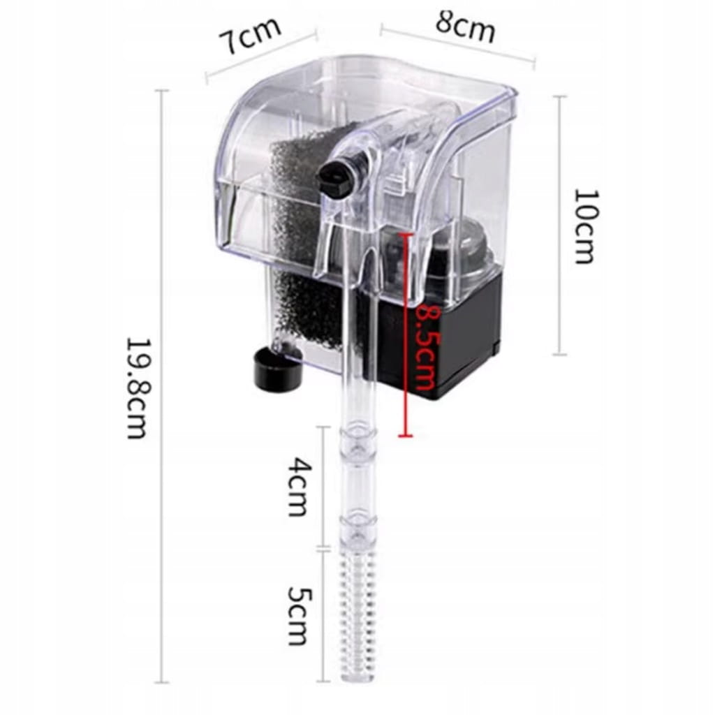 - Bezpieczny dla małych organizmów – osłona na rurce wlotowej zapobiega zassaniu ryb i krewetek.