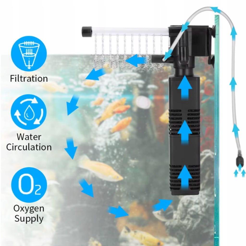 W akwarystyce jednym z najważniejszych elementów zdrowego zbiornika jest czysta, stabilna chemicznie woda o odpowiednim natlenieniu. Ten nowoczesny filtr wewnętrzny z gąbką filtrującą i deszczownicą łączy w sobie wydajność, cichą pracę oraz uniwersalne zastosowanie – zarówno w akwariach słodkowodnych, jak i dekoracyjnych systemach wodnych, takich jak ogrody wodne czy fontanny.