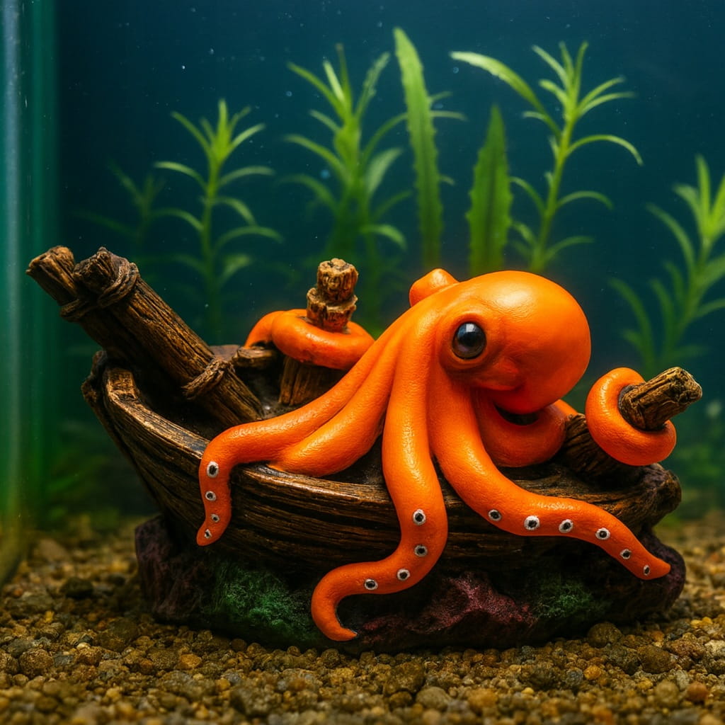 To nie tylko ozdoba, ale też praktyczny element aranżacji, który daje rybom przestrzeń do chowania się i odpoczynku. Intensywny kolor ośmiornicy sprawia, że dekoracja przyciąga uwagę i ożywia akwarium, dodając mu wyjątkowego charakteru.