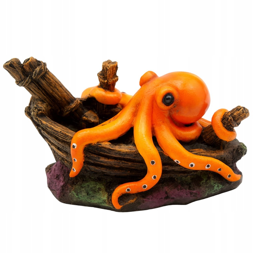 Dodaj do swojego akwarium morski klimat dzięki tej wyjątkowej ozdobie przedstawiającej ośmiornicę oplatającą wrak statku. To dekoracja, która nie tylko przyciąga wzrok swoim intensywnym kolorem, ale również tworzy bezpieczne miejsce do eksploracji dla ryb i krewetek.